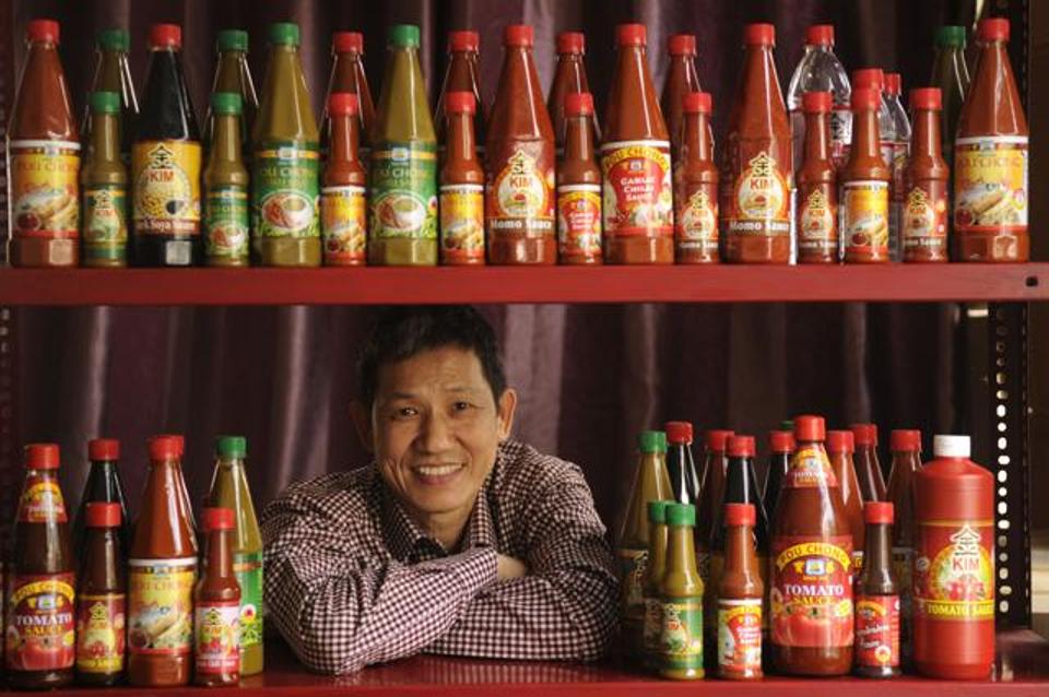 Owner of the Pou Chong brand, Dominic Lee at his shop at Tiretta Bazaar, the first Chinatown. The combination of the Pou Chong tomato and Pou Chong green chilli sauce is usually used with the Kolkata kathi roll. (Samir Jana/HT PHOTO)