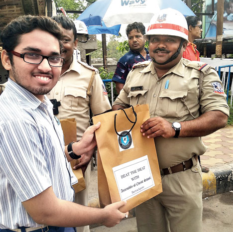 Students of Assembly of Christ School hit the road to express their gratitude to traffic cops who have to be on duty under the scorching sun. The students, along with vice-principal Rev. G. Samuel Davis, visited traffic kiosks between Barrackpore and Sodepur and handed over goody bags to the traffic cops. The campaign started from Lalkuthi in Barrackpore and covered Chiriamore, Titagarh and Khardah before ending at Sodepur. Each bag carried fruit juice, bottles of packaged drinking water, glucose drink and cucumbers.